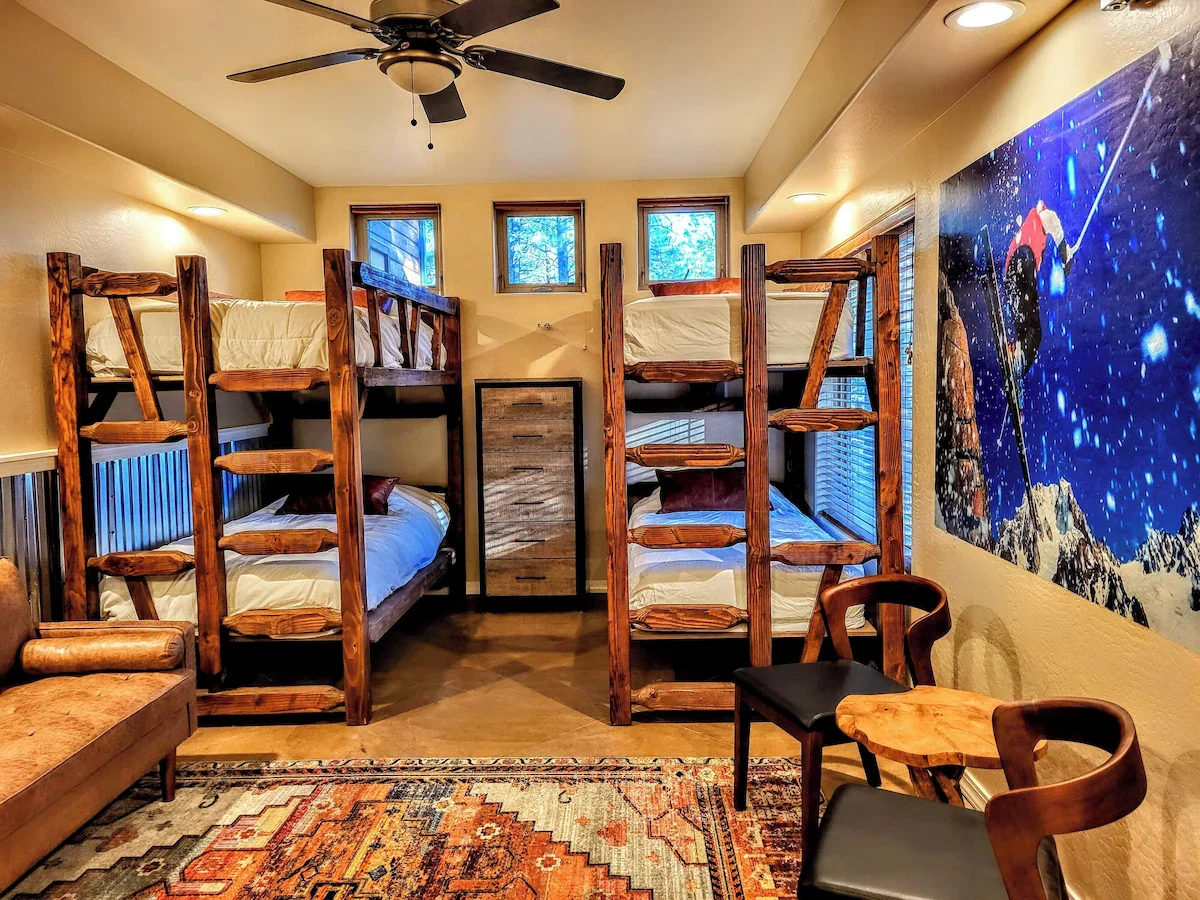 Expansive bunk room with adult-sized twin XL beds